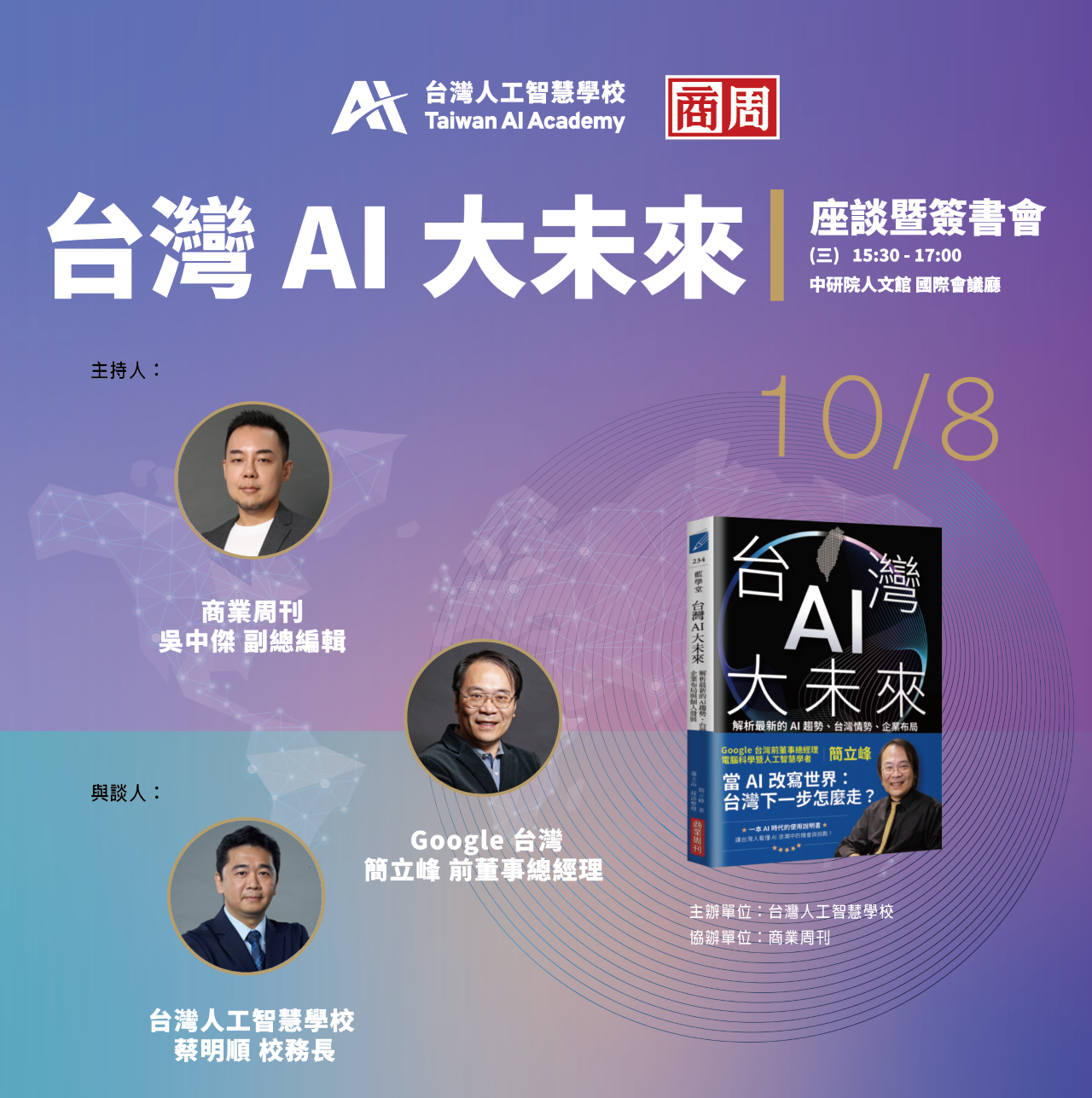 台灣人工智慧學校很榮幸邀請到商業周刊副總編輯吳中傑主持,由《台灣 AI 大未來》作者,同時也是 Google 台灣前董事總經理簡立峰博士與台灣人工智慧學校校務長蔡明順一同暢談台灣 AI 的發展與未來!